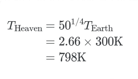 를 얻는다. 따라서 천국의 온도는 약 798K임을 알 수 있다.