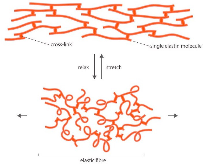 탄성소는 엘라스틴이라고 부릅니다. 탄성소 역시 교원질과 마찬가지로 생체 조직의 주요 구성요소입니다. 다만 탄성소는 당기는 힘에 대해 높은 저항력을 가진 '교원질'하고는 다릅니다. 외력이 작용하면 늘어났다가 외력이 사라지면 다시 원래 모습으로 돌아오는 '탄성 섬유'입니다.